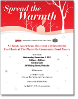 Your $20.00 donation to attend includes free drink tickets, wine and beer tasting and hors d'oeuvres. "Spread the Warmth" is being sponsored by Plainville Oil and Tower Energy, and all proceeds from the event will directly benefit the Fuel Bank of PCFP. In addition, Plainville Oil will donate $10.00 worth of home heating oil for every $10.00 raised at the event, up to $10,000.00.PCFP provides food, clothing, emergency energy assistance, furniture and household items, crisis intervention and referral services to Plainville residents in need. PCFP also provides Thanksgiving, Christmas and Easter baskets, as well as special programs for children of adult registrants. For information on "Spread the Warmth" or to donate directly, visit www.thefoodpantry.net or call (860)747-1919.